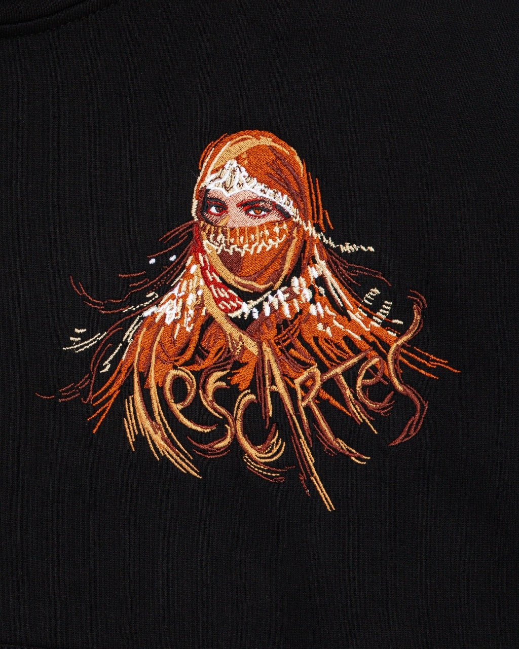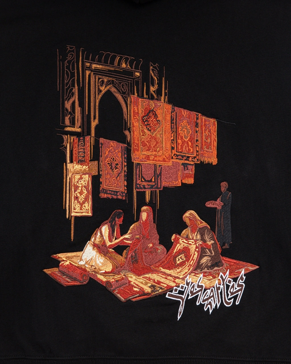 The Arima Hoodie is crafted from heavyweight 400GSM organic cotton in a deep, pure black finish. Intricate embroidery brings the garment to life, telling a visual story rooted in Arabic and oriental heritage. Features a mysterious veiled figure on the chest and an expansive marketplace scene on the back.