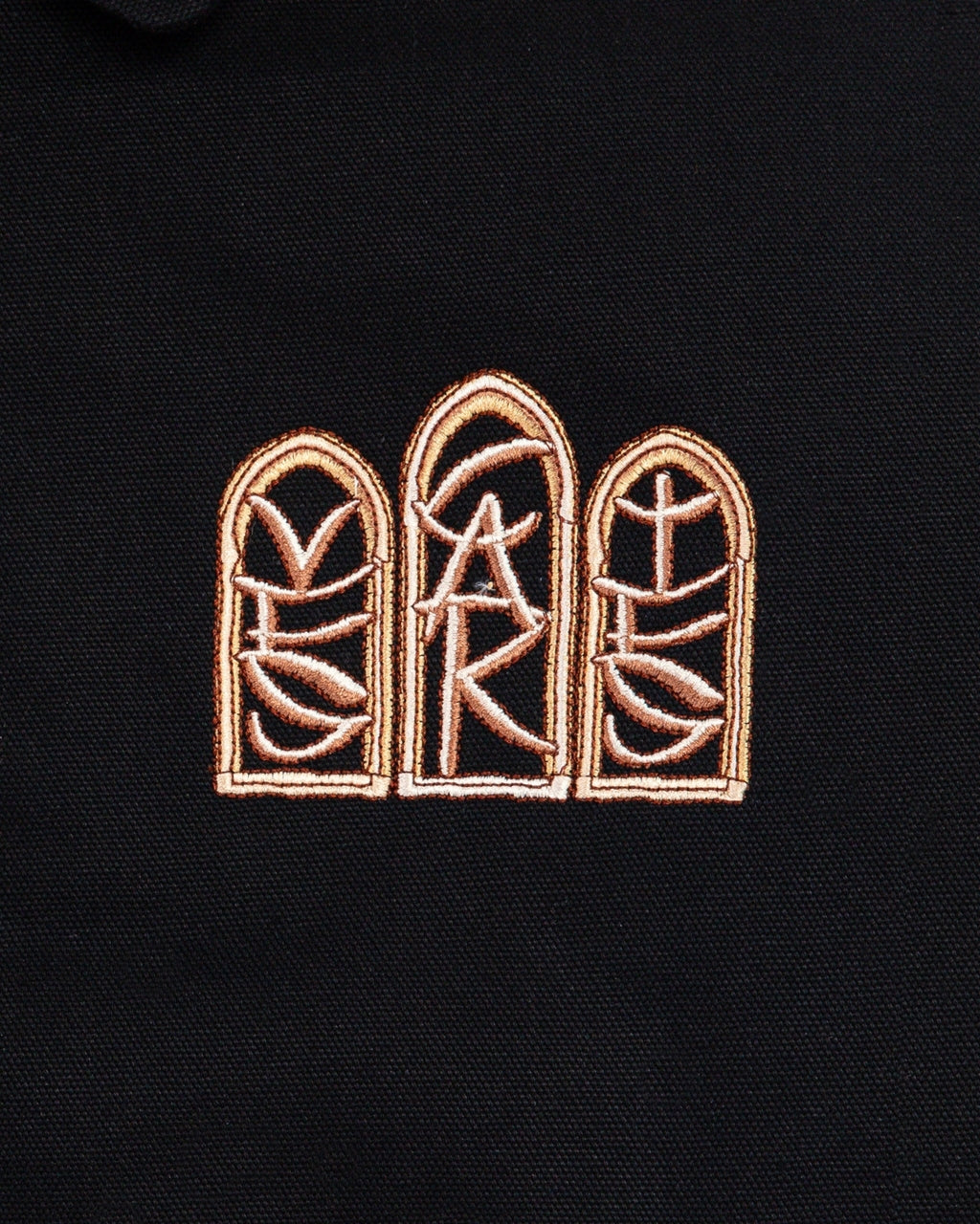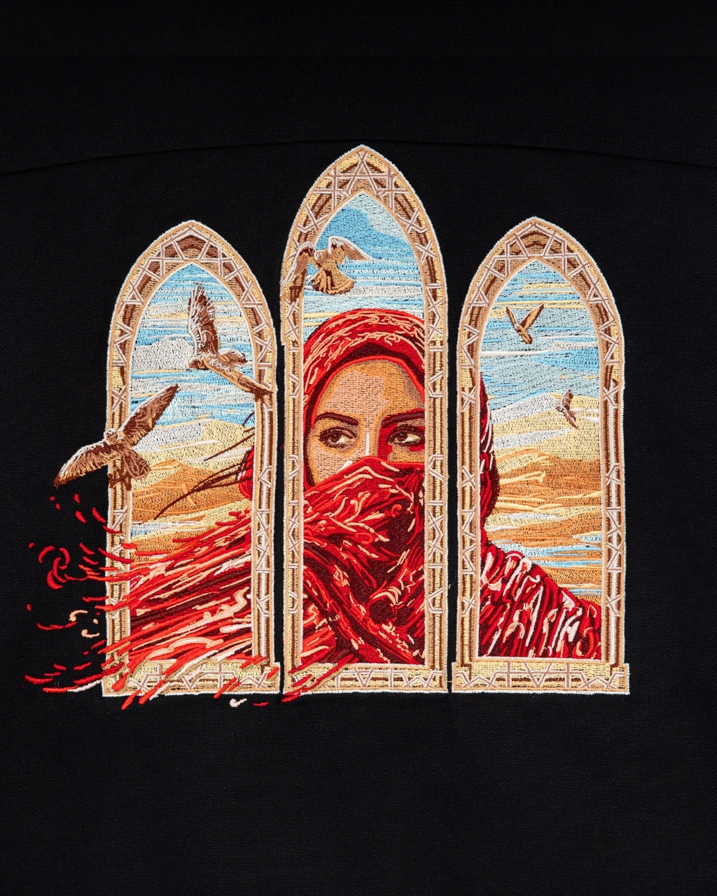 Black canvas jacket with a minimal embroidered crest on the front, that nods to classical Arabic window motifs. The back carries a three-window scene depicting a veiled woman set against desert skies, framed in ornate architectural arches. Finished with coin-engraved hardware and heavy insulation.