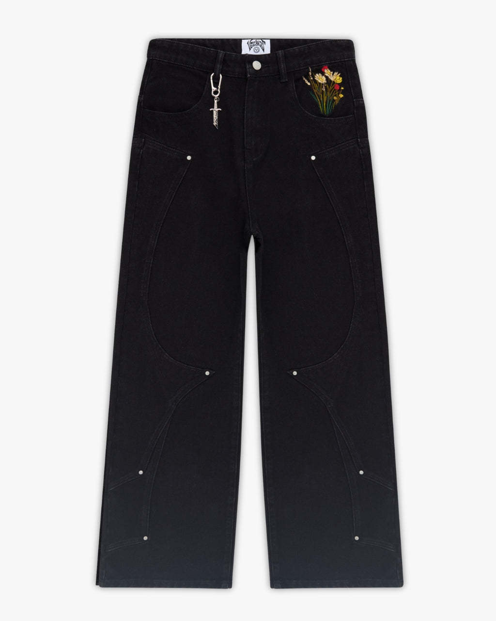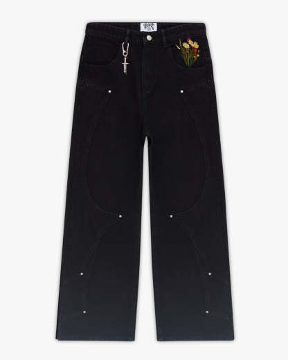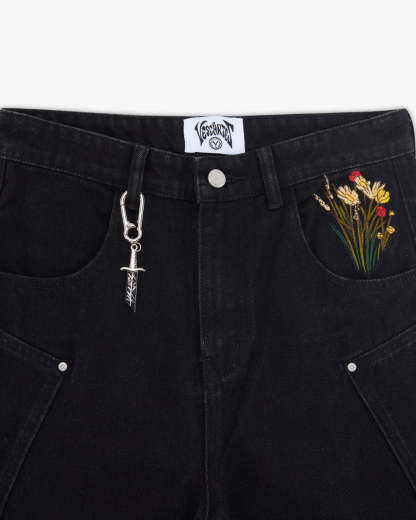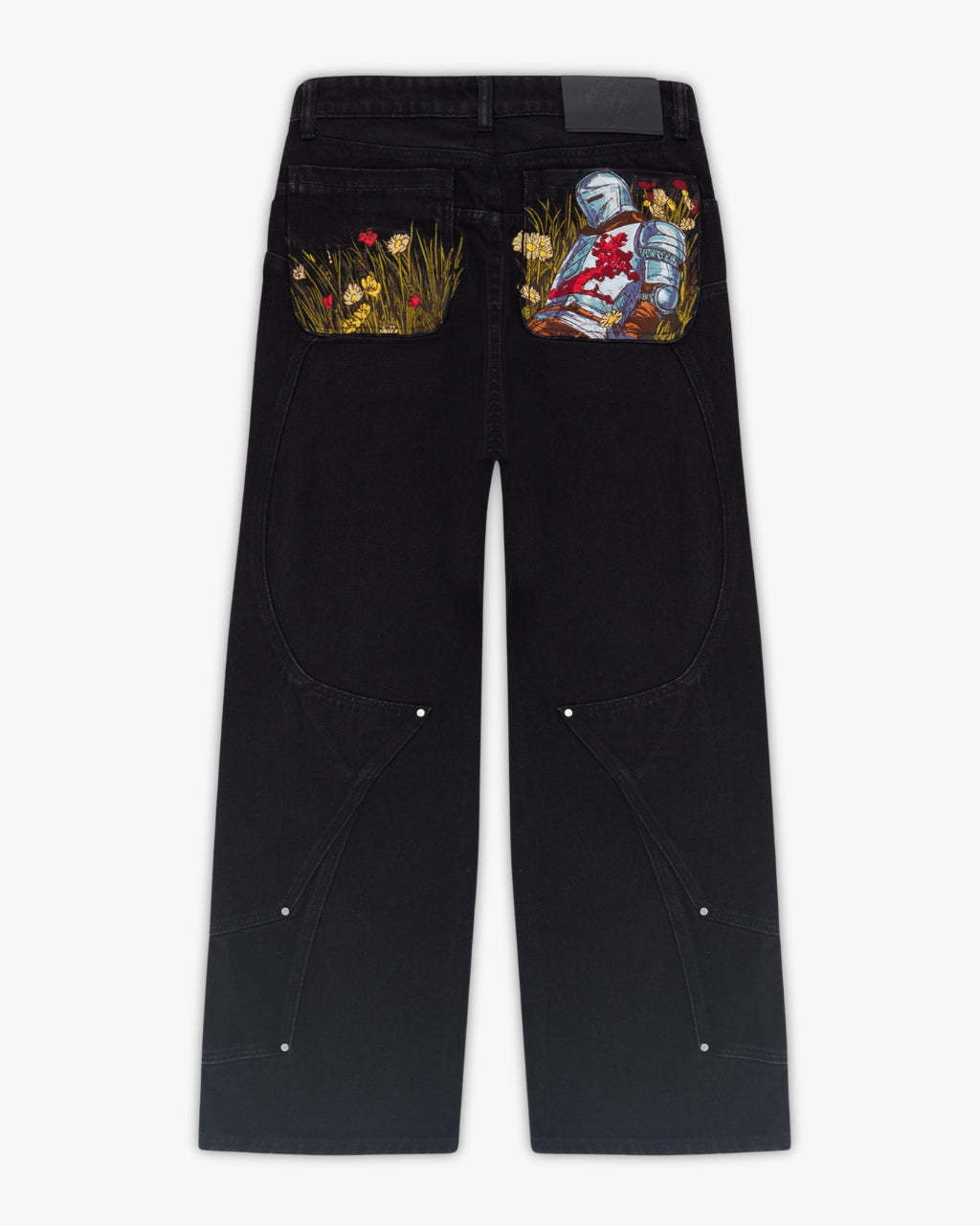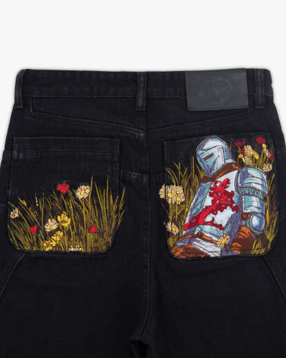 Cut from pure black denim with custom panelling and metal rivet detailing. Back pocket embroidery of a medieval knight resting on a vibrant bed of flowers, with contrasting silver armour and red accents with rich green, yellow, and red blooms. Finished with a debossed leather tab and engraved sword carabiner.