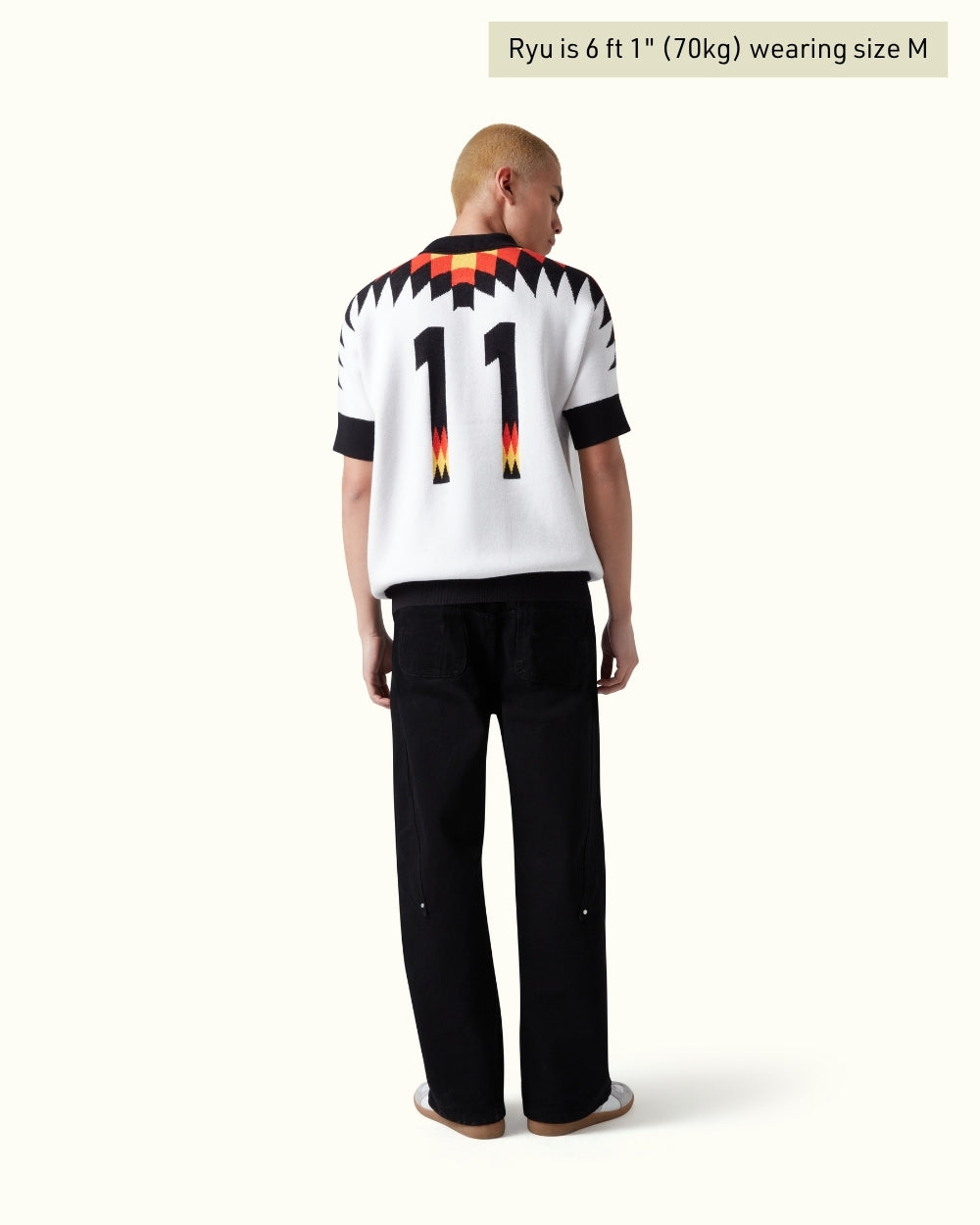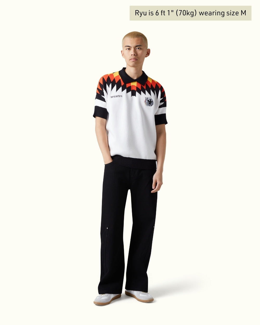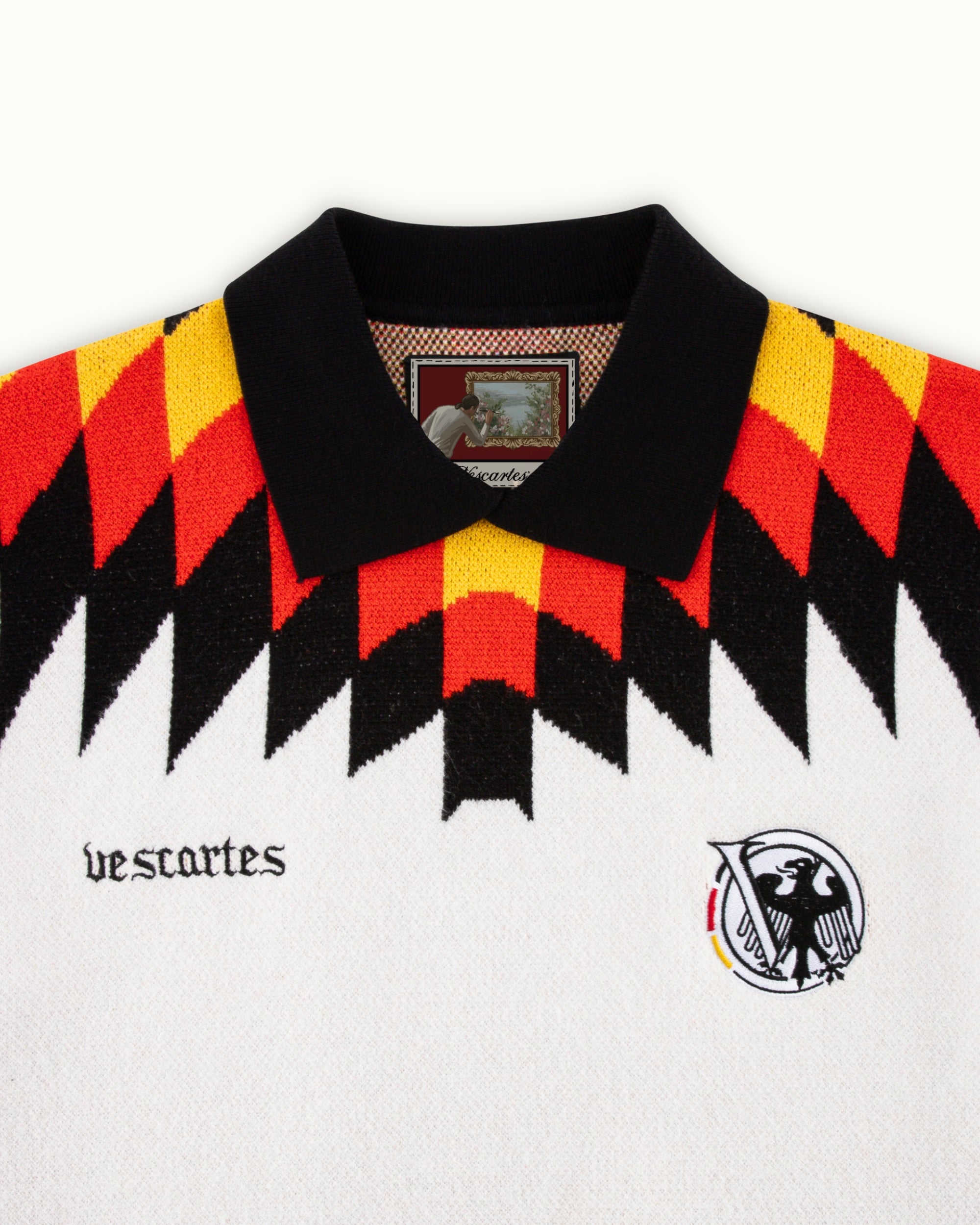 A reimagined classic, this knitted jersey takes inspiration from the legendary 1994–96 Germany kit—reinterpreted through a Vescartes lens. Crafted in a cream-toned weave, it features a bold geometric wing pattern across the shoulders and number detailing on the back.