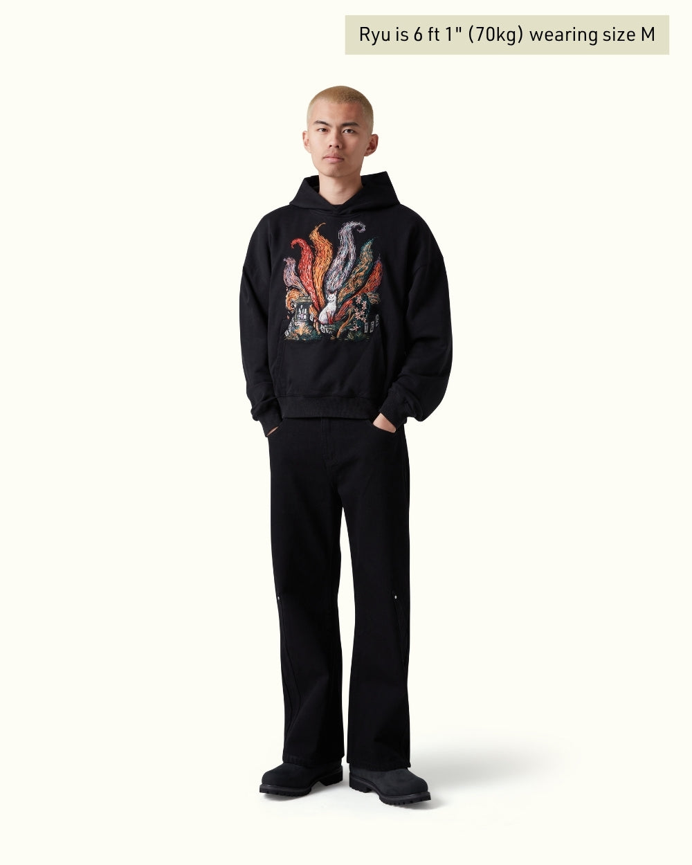 A heavyweight essential elevated through detailed storytelling, the Kitsune Hoodie features a fully embroidered scene rooted in Japanese folklore. The front artwork centres on a white fox, framed by a shrine and forest elements, with eight flowing tails rising above in vivid colour.