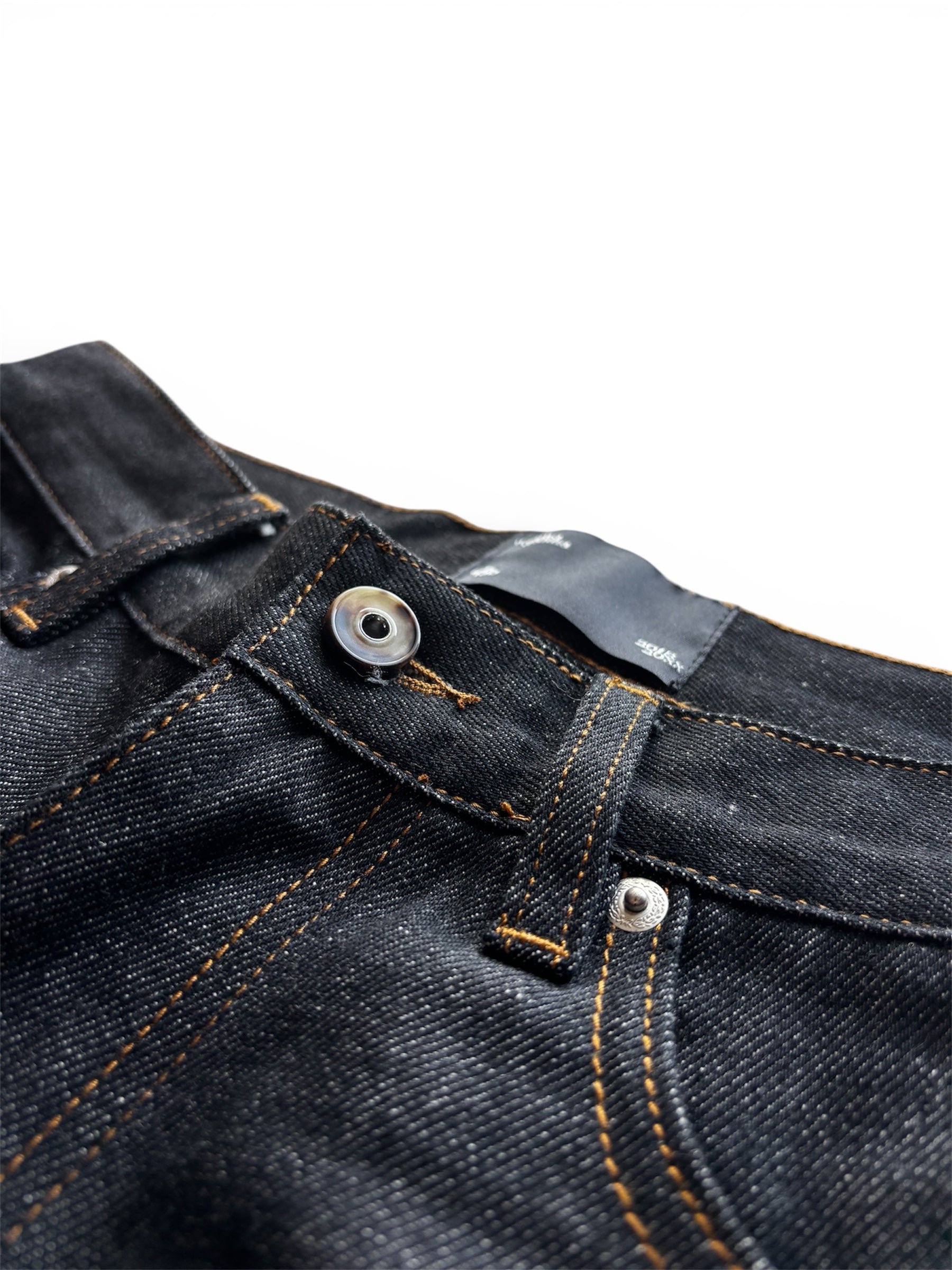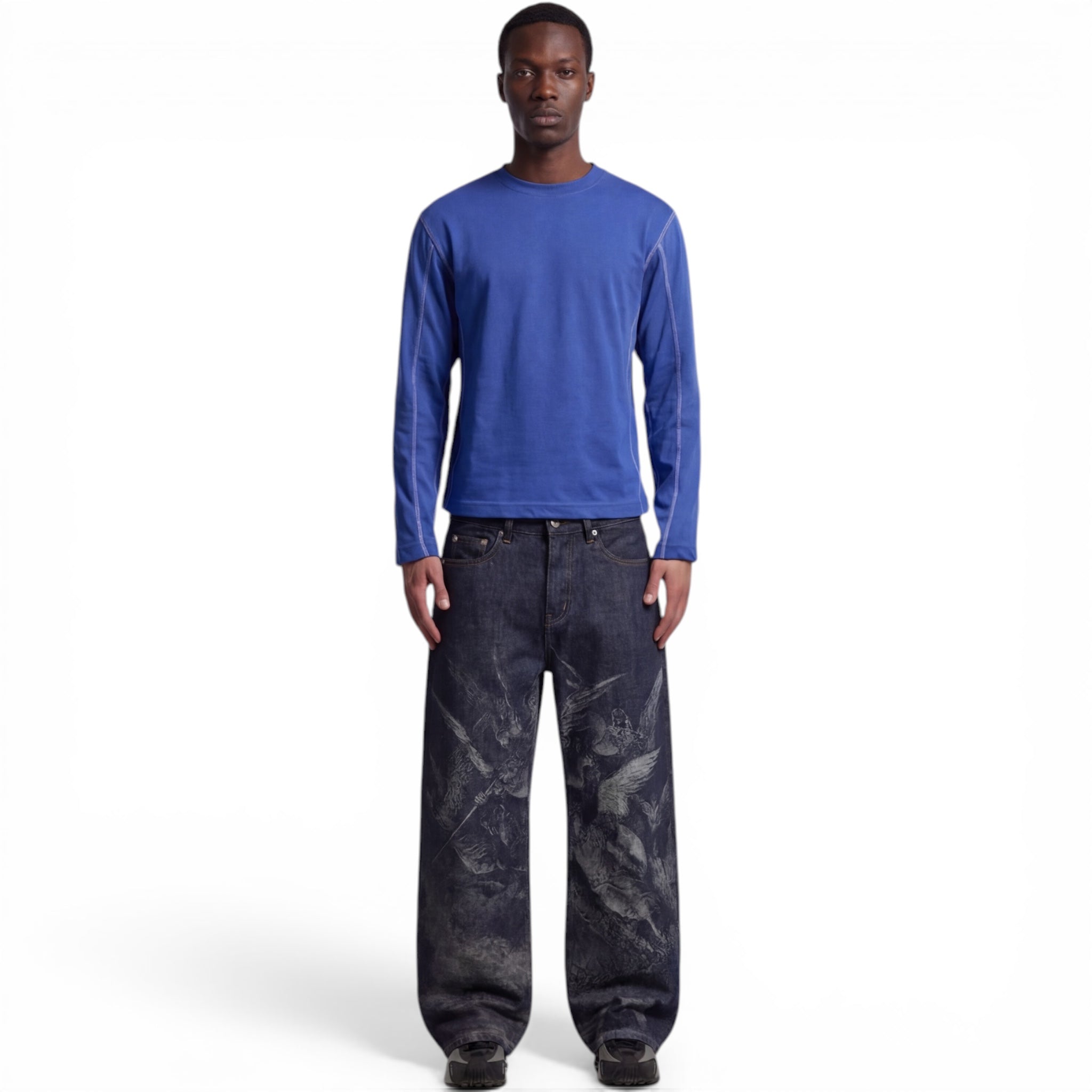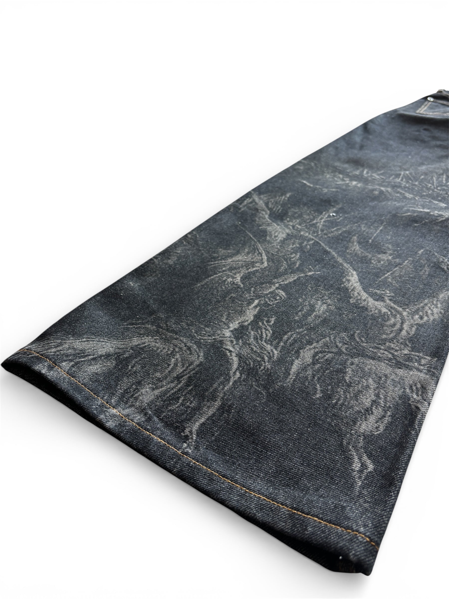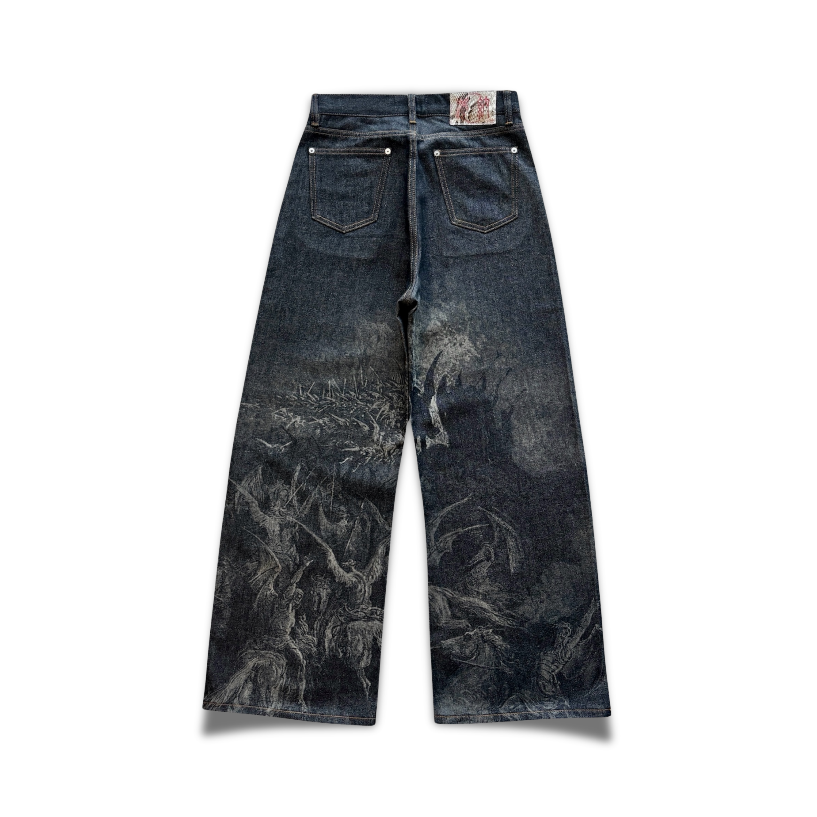 Made from 13oz Japanese raw denim, these wide-leg jeans feature the art of John Milton's "Paradise Lost" applied via laser burn. Each pair is custom made and finished with a genuine python skin back tab.