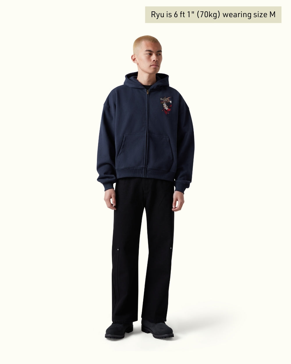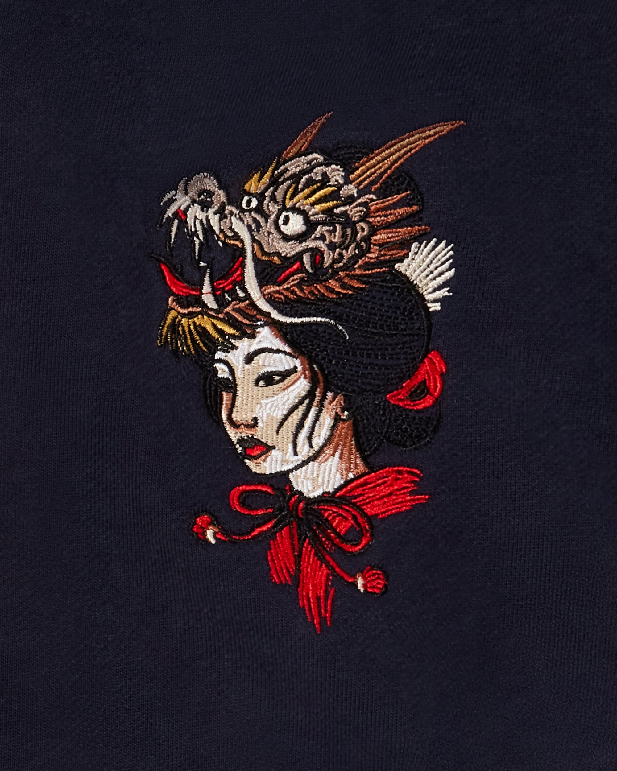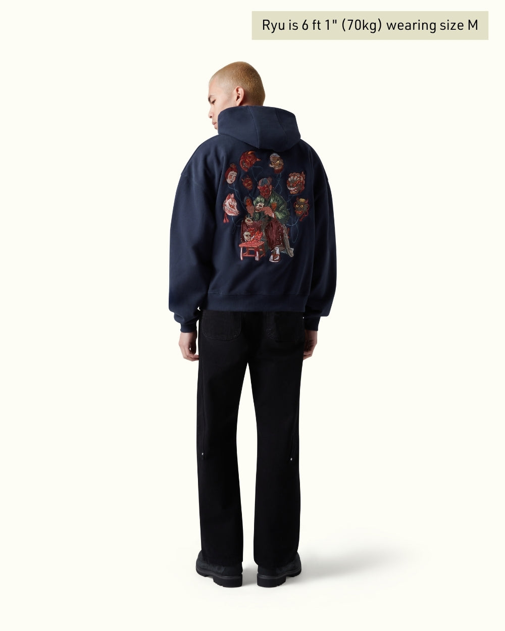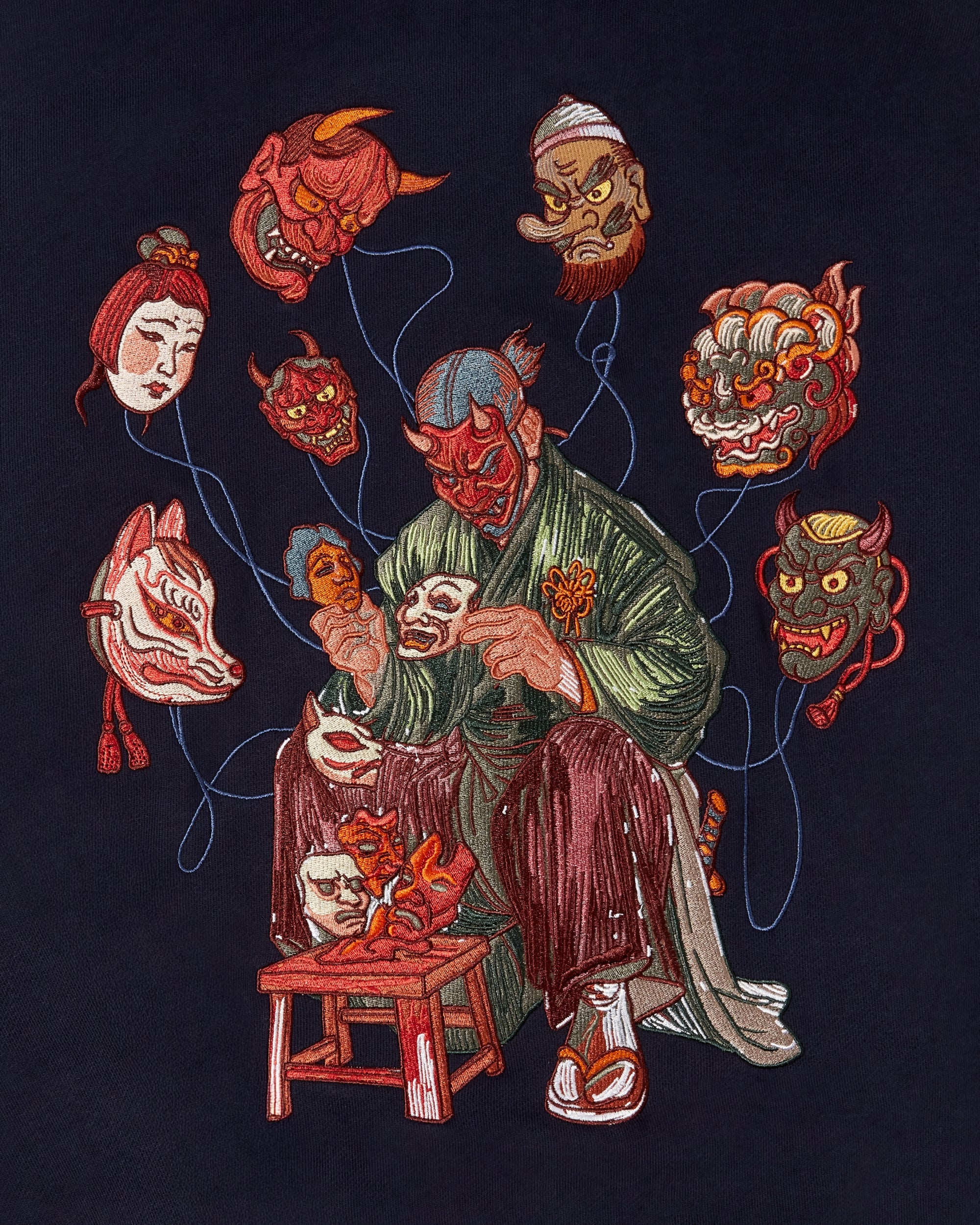Features a minimal front crest with an expansive embroidered composition across the back. The scene captures a mask maker mid-process, encircled by floating forms that suggest movement and tension. A deep navy base allows the red-led palette to stand forward.