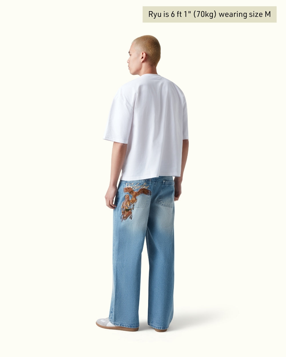 Cut in a light blue wash and elevated with intricate embroidery inspired by Arabic falconry traditions. A front-pocket eagle adds a subtle touch, contrasted by a large hero embroidery on the back — a falconer and his bird rendered across and beyond the rear pocket. Finished with a premium black leather Vescartes patch.